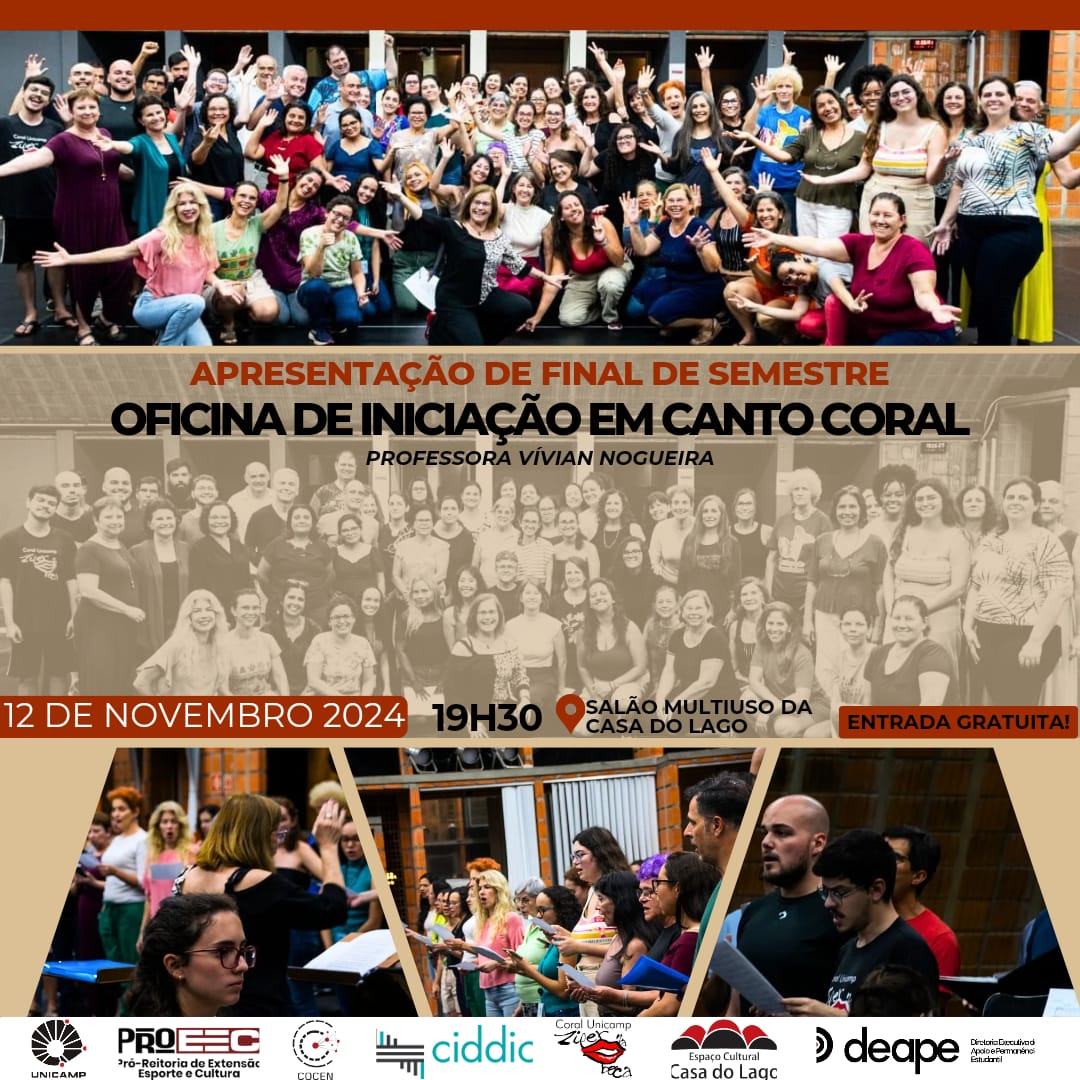 A PROEC e o Espaço Cultural Casa do Lago convidam a comunidade para a apresentação de final de semestre da Oficina de Iniciação em Canto Coral, ministrada pela professora Vivian Nogueira.