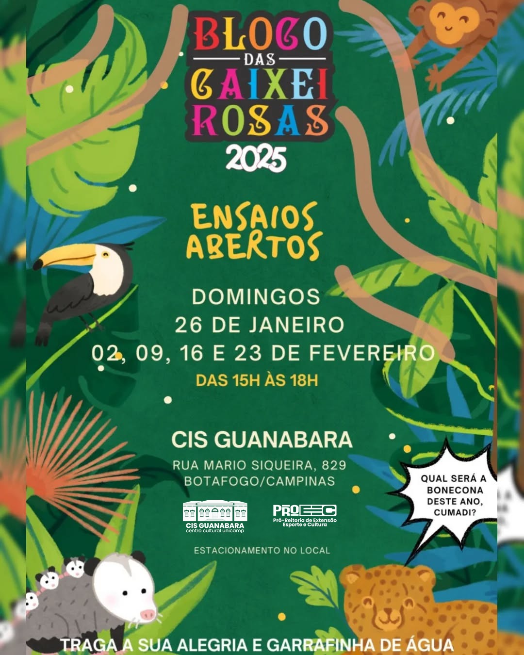 Tradicional de Barão Geraldo, o Bloco das Caixeirosas foi fundado em 2006 pelas Caixeiras de Campinas. Todo ano, no carnaval, o grupo apresenta uma nova boneca, acompanhada de sua história e música, que passa a integrar o cortejo. Os ensaios, gratuitos e abertos a crianças e adultos, acontecem aos domingos, das 15h às 18h, no CIS Guanabara da ProEEC (Pró-reitoria de Extensão, Esporte e Cultura) , entre 26 de janeiro e 23 de fevereiro.