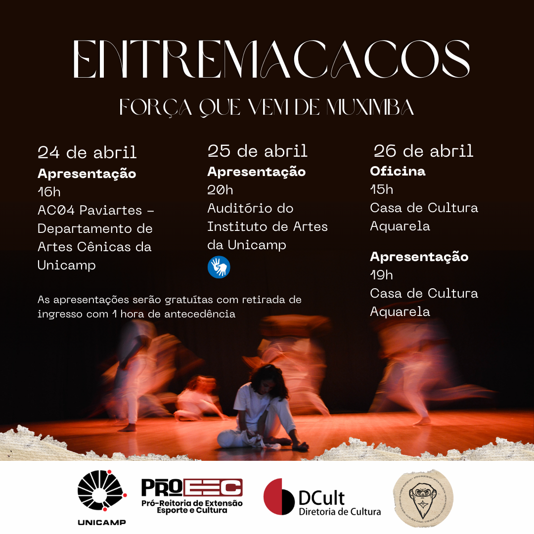 Nos dias 24, 25 e 26 de abril, o Coletivo Negro Drama (@negro.dram4), formado por estudantes negros do curso de Artes Cênicas (IA) da Unicamp , apresenta o espetáculo “Entre Macacos: Força que Vem de Muximba” (@entremacacos). A peça é fruto de um processo artístico colaborativo que surgiu dentro do coletivo, tendo como ponto de partida uma cena curta baseada na obra Macacos, de Clayton Nascimento, apresentada no Festival de Cenas Curtas.