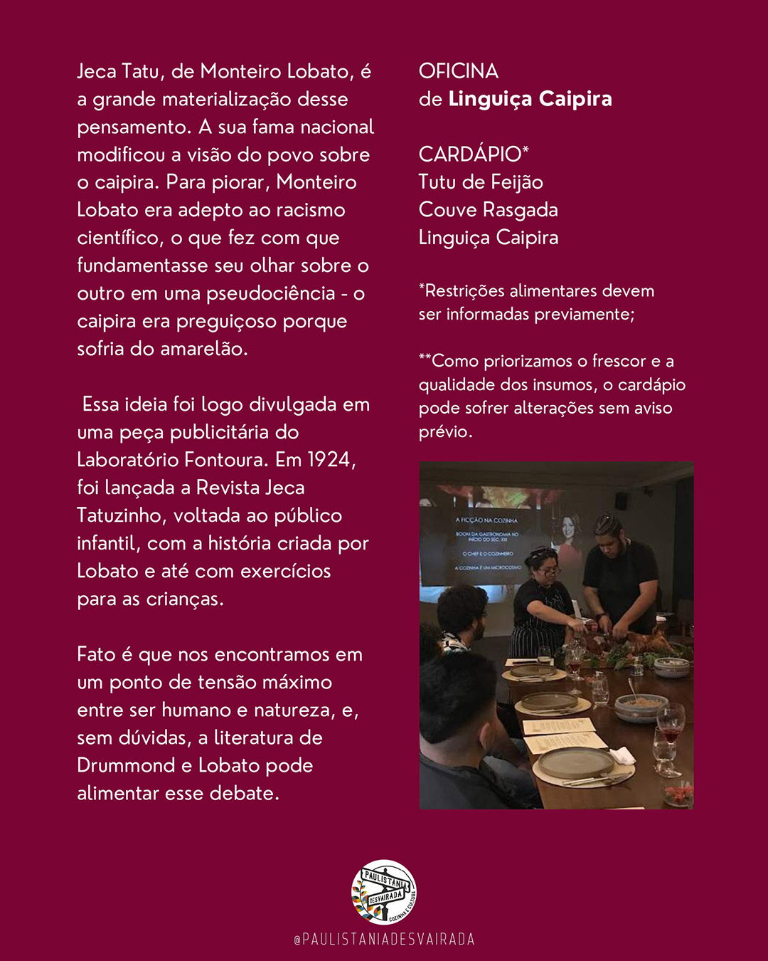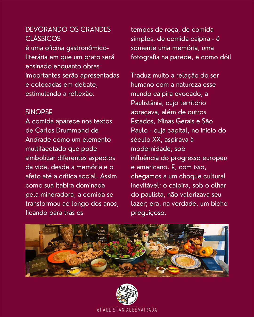 Junte-se a nós para uma experiência única que combina gastronomia e literatura! Vamos explorar os textos de Carlos Drummond de Andrade e Monteiro Lobato enquanto preparamos e degustamos pratos típicos da cultura caipira.
