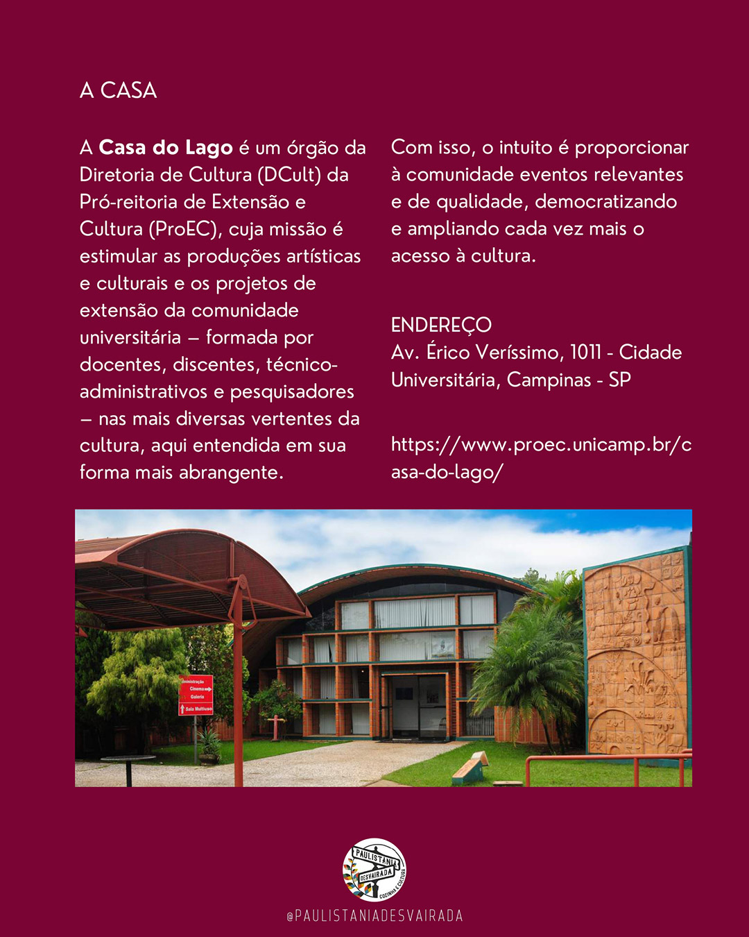 - Local: Espaço Cultural Casa do Lago, Unicamp – Avenida Érico Veríssimo, 1011, Cidade Universitária, Campinas, SP.