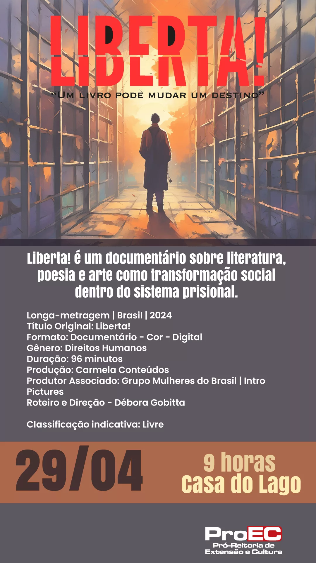 No próximo, dia 29 de abril, às 9 horas, na sala de cinema da Casa do Lago. Será exibido o documentário “Liberta!”, dirigido e roteirizado por Débora Gobbita. O longa-metragem aborda a literatura, poesia e arte como transformação social dentro do sistema prisional.