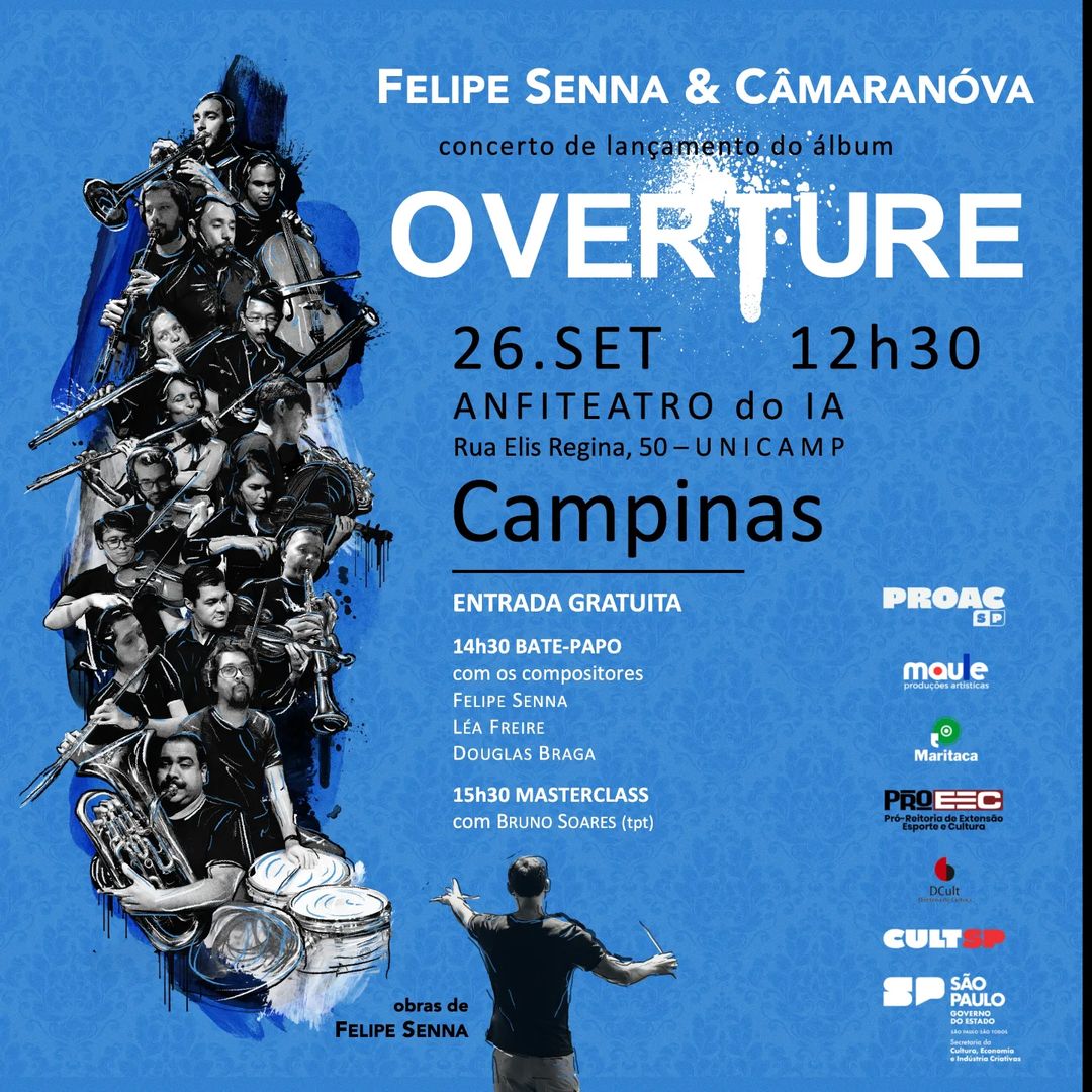 No dia 26 de Setembro de 2024, o compositor Felipe Senna e os músicos do Câmaranóva realizaram o primeiro concerto de lançamento do álbum OVERTURE no Auditório do IA. No repertório estiveram obras originais de Felipe que propõem um diálogo entre a música de concerto e a cultura do nosso próprio país. Após o concerto, houve um bate papo com os compositores Léa Freire, Douglas Braga e o próprio Felipe Senna, além de uma masterclass de trompete com Bruno Soares.
