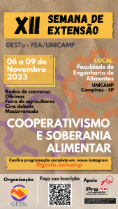 O Grupo de Extensão Social e Tecnológica (GESTo) da Faculdade de Engenharia de Alimentos (FEA) promove, de 6 a 9 de novembro, a partir das 9h, na FEA, a XII Semana de Extensão com o tema “Cooperativismo e Soberania Alimentar”. O evento conta com apoio da Pró-reitoria de Extensão e Cultura (Proec).