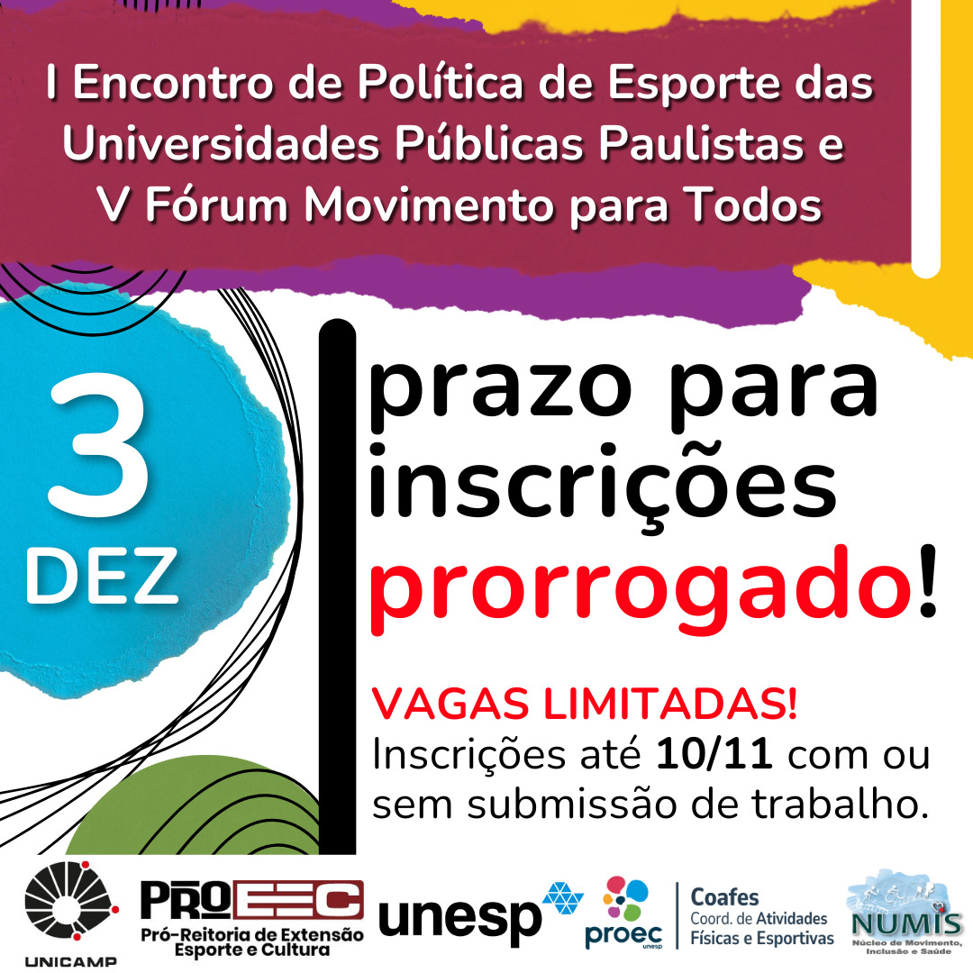 O I Encontro de Política de Esporte das Universidades Públicas Paulistas e o V Fórum Movimento para Todos ocorrerão no dia 03 de dezembro de 2024, na Faculdade de Educação Física da Unicamp, em Campinas, e reunirão servidores técnico-administrativos, docentes e discentes da Universidade de São Paulo (USP), Universidade Estadual de Campinas (Unicamp) e Universidade Estadual Paulista (Unesp).