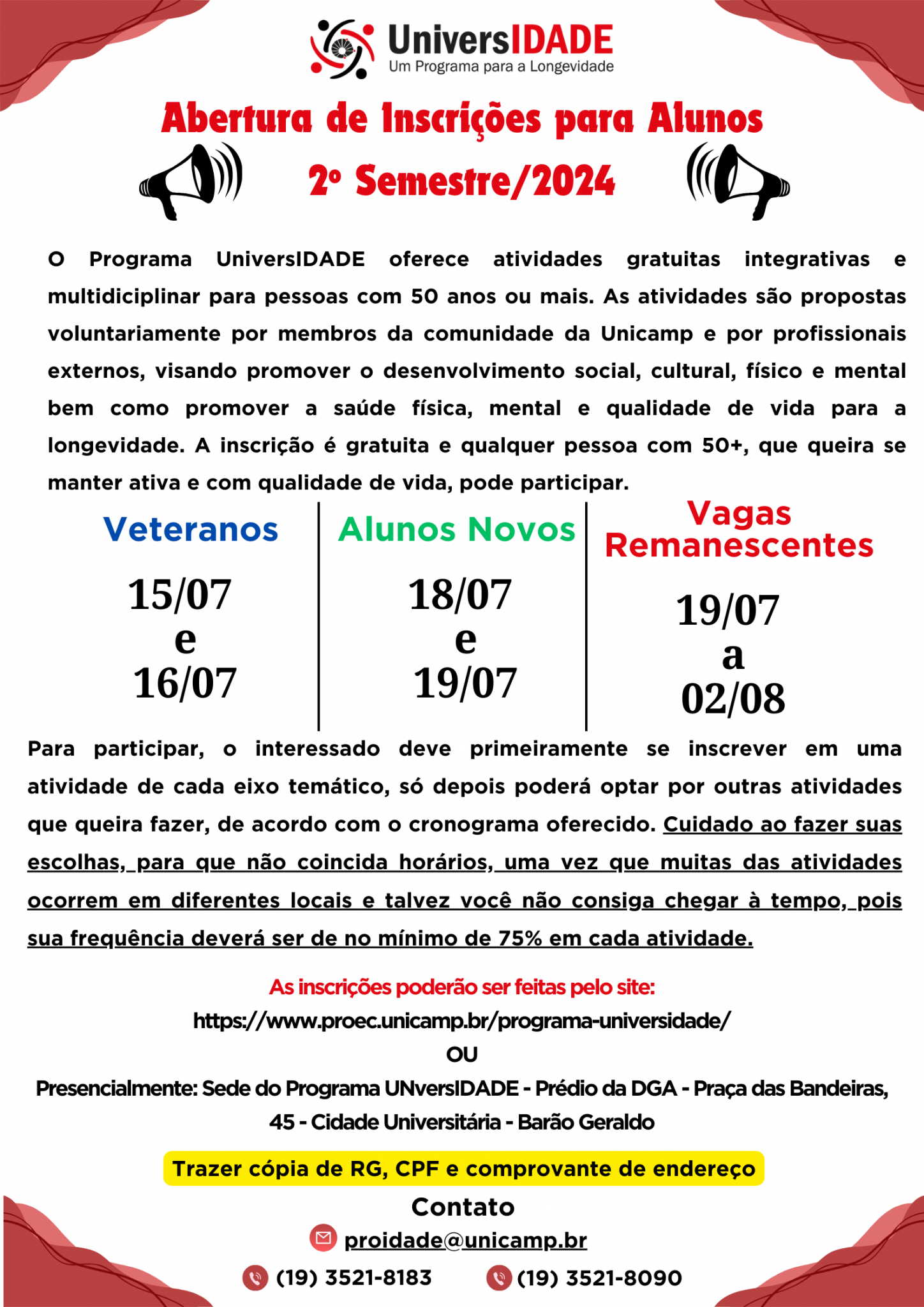 As inscrições podem ser feitas de forma virtual através do sistema online disponível no site Programa UniversIDADE ou presencialmente no Prédio da DGA – Praça das Bandeiras, 45 – quadra 2 – prédio 1 – Cidade Universitária – Barão Geraldo. O atendimento presencial ocorre das 9h às 13h, e também é possível obter informações pelos telefones (19) 3521-8183 ou (19) 3521-8090.
