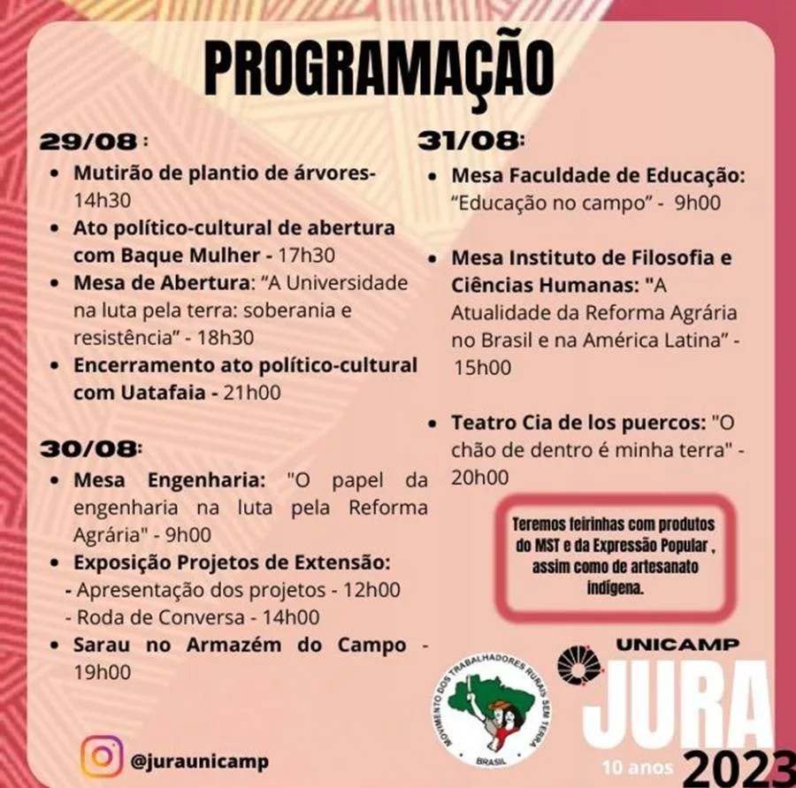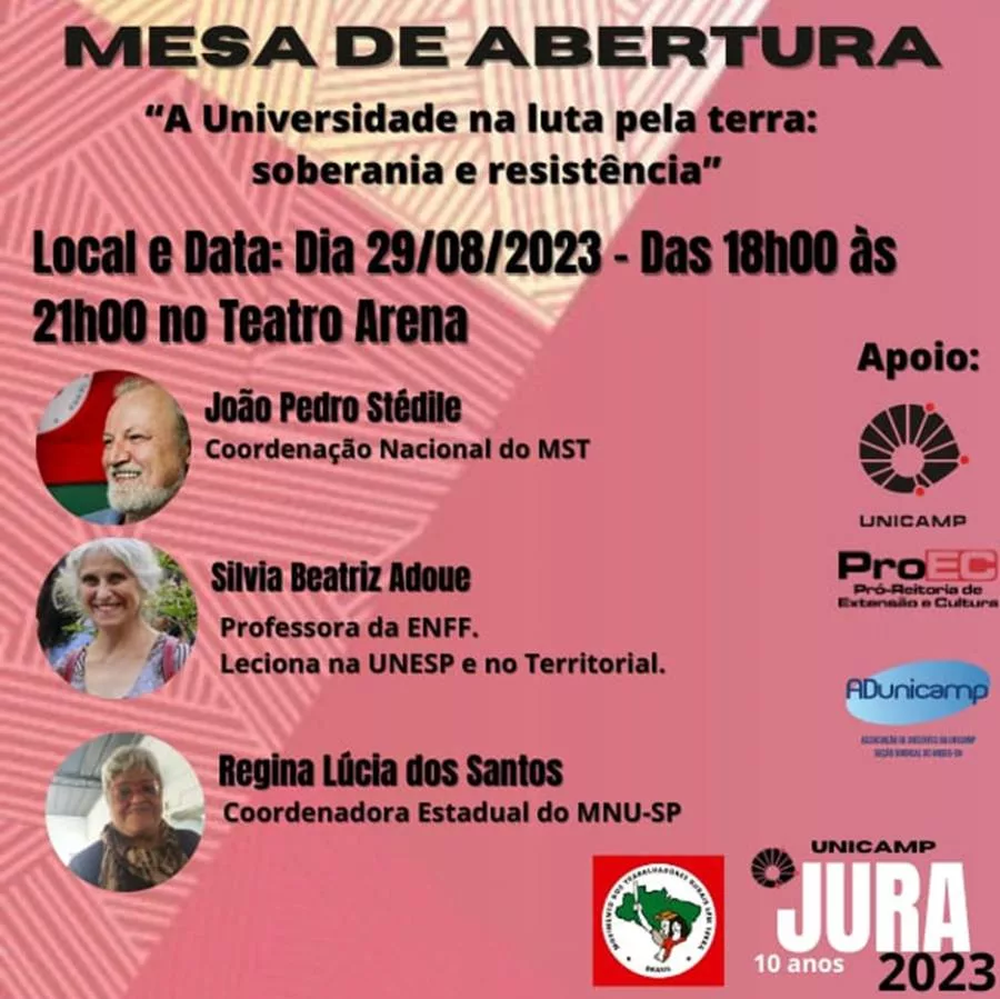 Nos dias 29, 30 e 31 de agosto, ocorrerá a Jornada Universitária pela Reforma Agrária (Jura) da Unicamp, no campus de Barão Geraldo, em Campinas (SP). O evento é organizado pelo Movimento dos Trabalhadores Rurais Sem Terra (MST) em parceria com docentes e discentes da Universidade e conta com o apoio da Reitoria e da Pró-Reitoria de Extensão e Cultura (Proec), assim como da Associação de Docentes da Unicamp (Adunicamp).