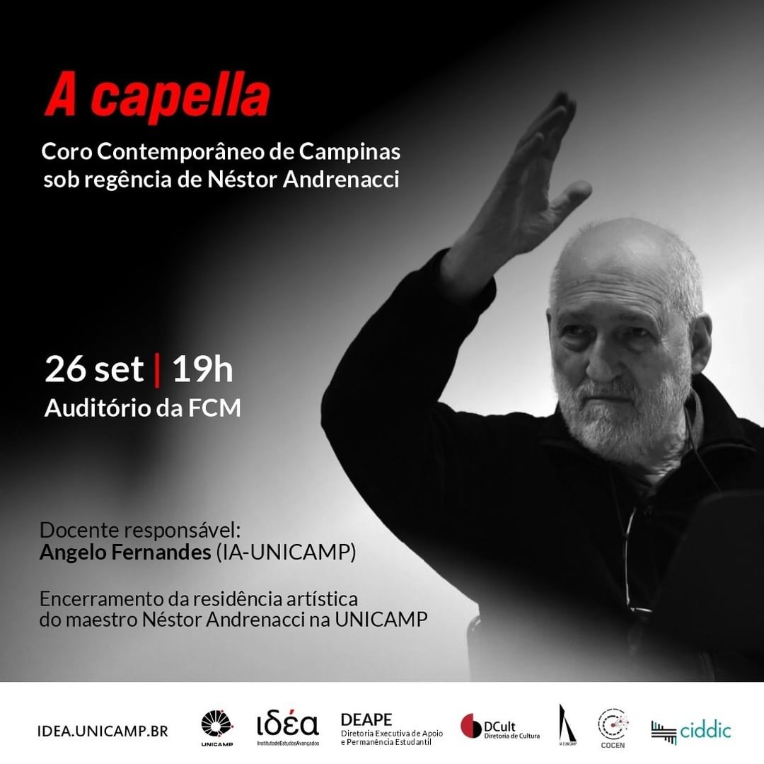 No dia 26 de setembro, às 19h, o maestro e regente do coral argentino, Néstor Andrenacci, encerrará sua residência artística do Programa “Hilda Hilst” do Instituto de Estudos Avançados (IdEA), com o concerto “A Capella”, regendo o Coro Contemporâneo de Campinas. O evento acontece em parceria com a Diretoria de Cultura (DCult) da Pró-reitoria de Extensão, Esporte e Cultura (ProEEC) da Unicamp.
