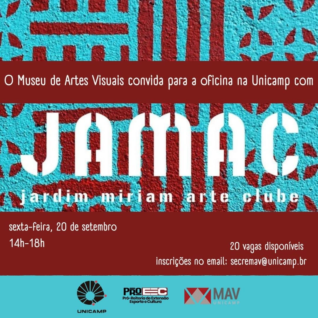 O Museu de Arte Visuais convida para uma oficina com o Jardim Miriam Arte Clube (JAMAC), que ocorrerá na Unicamp na sexta-feira, dia 20 de setembro 2024, entre 14h e 18h.