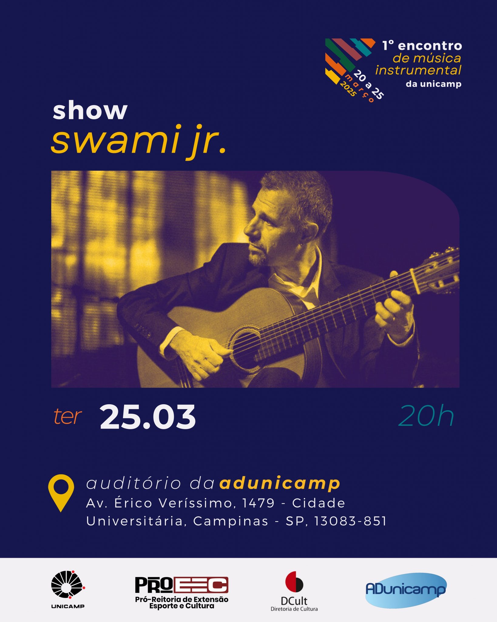 A Diretoria de Cultura (DCult) da Unicamp convida a comunidade para mais uma edição especial do Palco DCult, que desta vez recebe o renomado músico Swami Jr. O evento acontece nesta terça-feira, 25 de março, às 20h, na Adunicamp, com entrada gratuita.