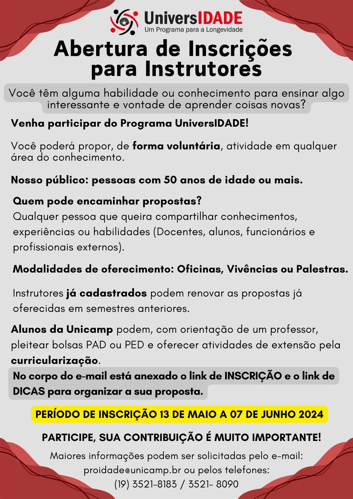 Iniciaremos as inscrições para proposta de atividade para ser oferecida no 2º semestre de 2024, junto ao Programa UniversIDADE.