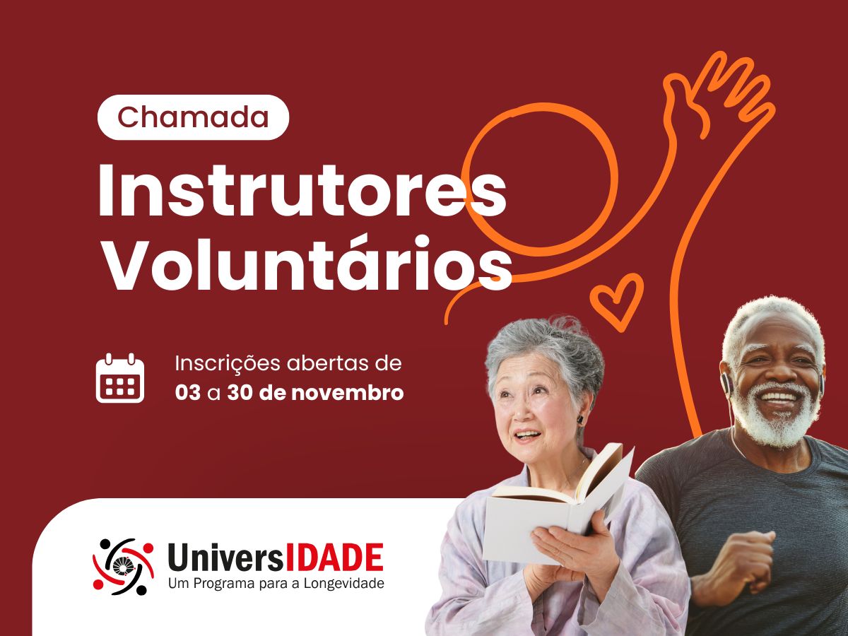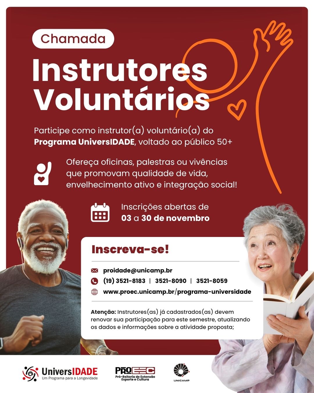 Estão abertas as inscrições para o processo de seleção de instrutores(as) voluntários(as) do Programa UniversIDADE, da Unicamp, voltado ao público com 50 anos ou mais. O período de inscrição vai de 03 a 30 de novembro de 2025.