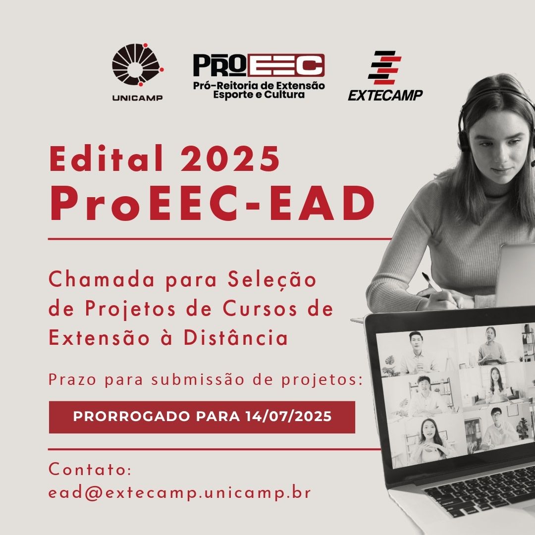 Informamos que o prazo para submissão dos Projetos para desenvolvimento e oferecimento de Cursos de Extensão a distância do Edital ProEEC-EAD 02/2025, foi prorrogado para o dia 14 de julho 2025 às 23h59.