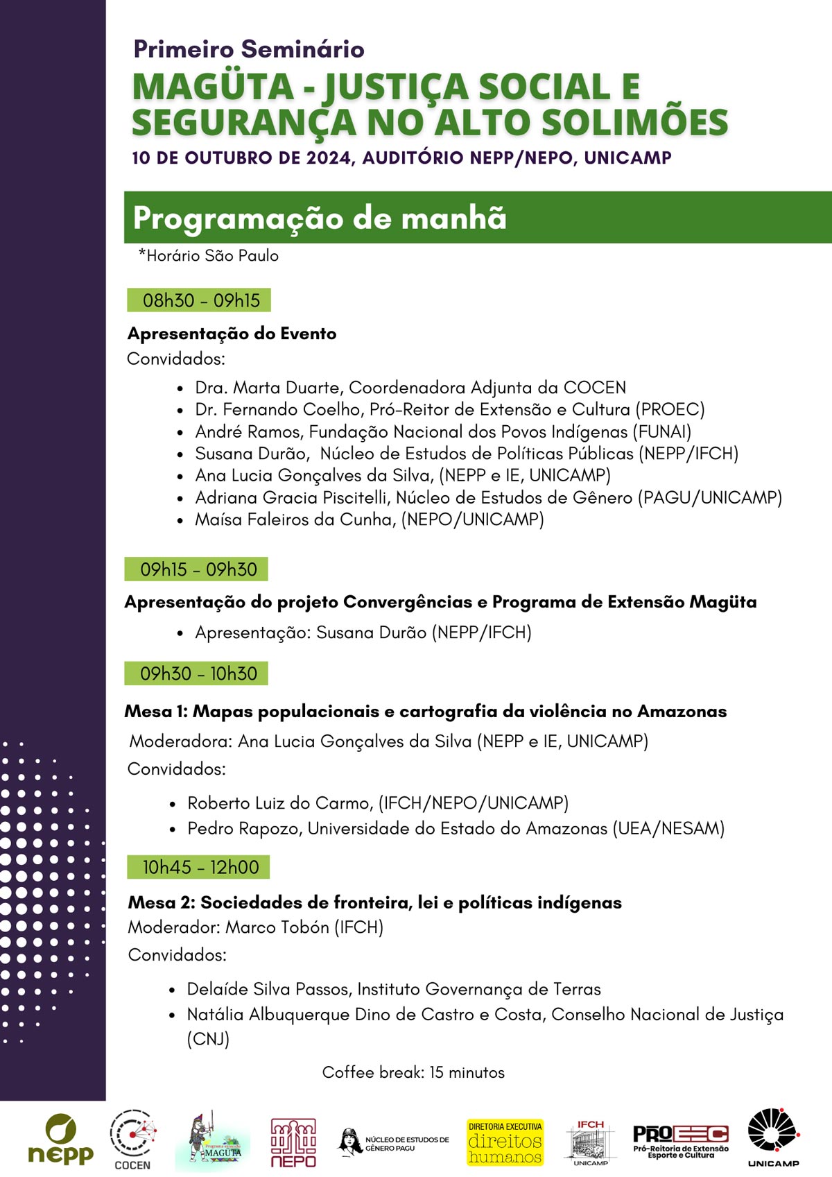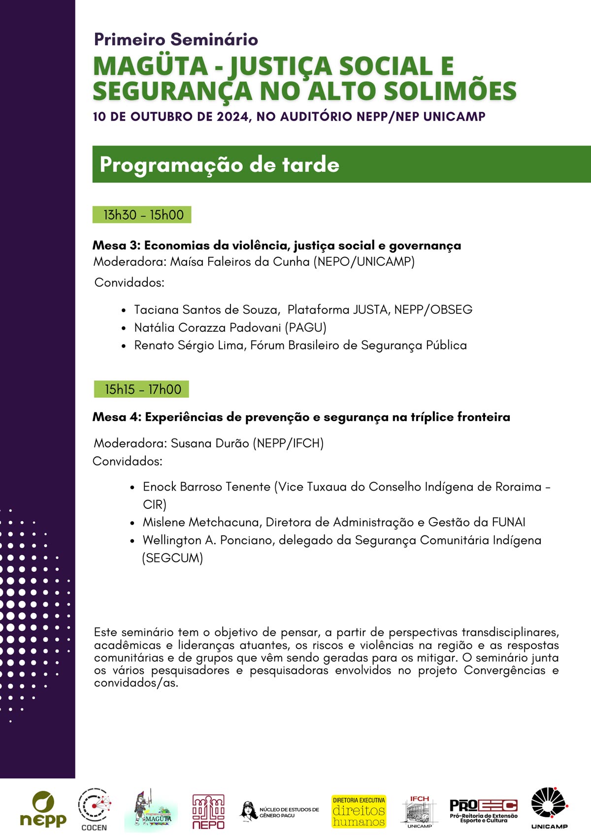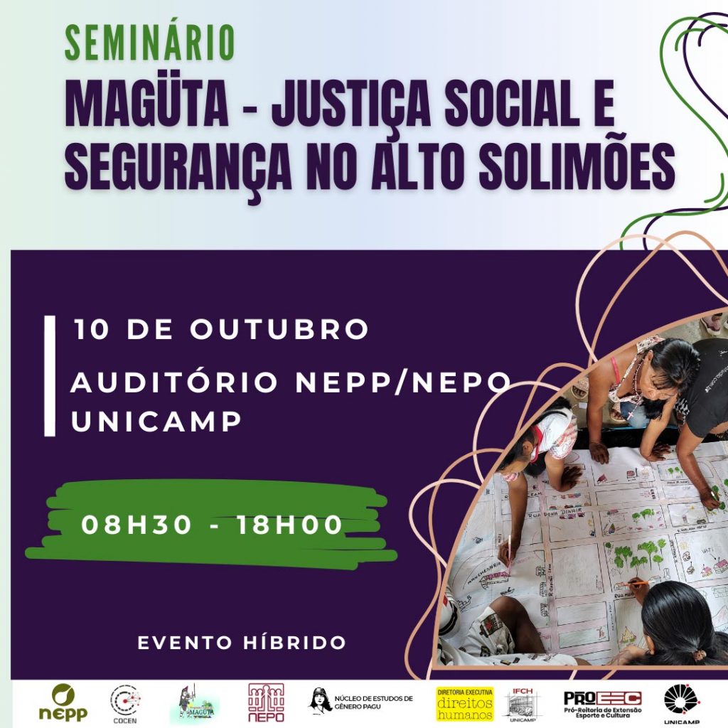 O Programa de Extensão “MAGÜTA: segurança humana da Amazônia” realizará seu primeiro seminário, na próxima quinta-feira (10), a partir das 8h30. O evento tem como tema “Justiça social e segurança no alto Solimões” e acontecerá no auditório NEPP/NEPO, dos núcleos de estudos de População “Elza Berquó” e de Políticas Públicas.